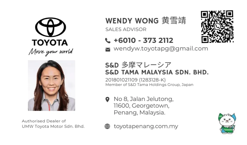 Hi! I’m Wendy, certified and registered Toyota Sales Advisor based in Penang, with over 26 years of proven experience in the automotive industry. I specialize in helping customers across Penang, Kedah, and the rest of Peninsular Malaysia find and own their perfect Toyota car.